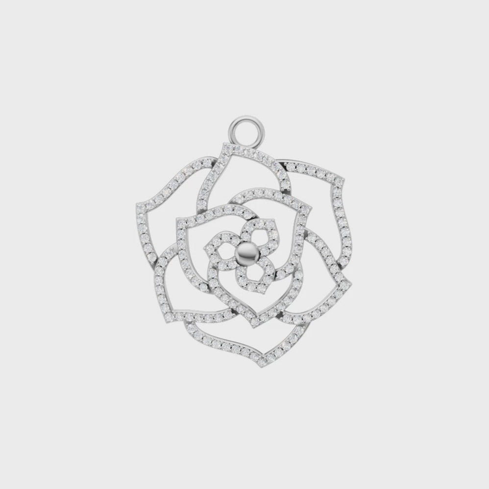 A beautifully crafted floral diamond pendant inspired by the elegance of blooming petals. Designed with layered openwork petals encrusted with shimmering stones, this piece creates a radiant play of light while maintaining a light, airy feel. The delicate center detail adds depth and charm, making it a perfect symbol of grace, femininity, and timeless beauty. Ideal for everyday elegance or special occasions, this pendant brings a soft yet luxurious touch to any jewelry collection.